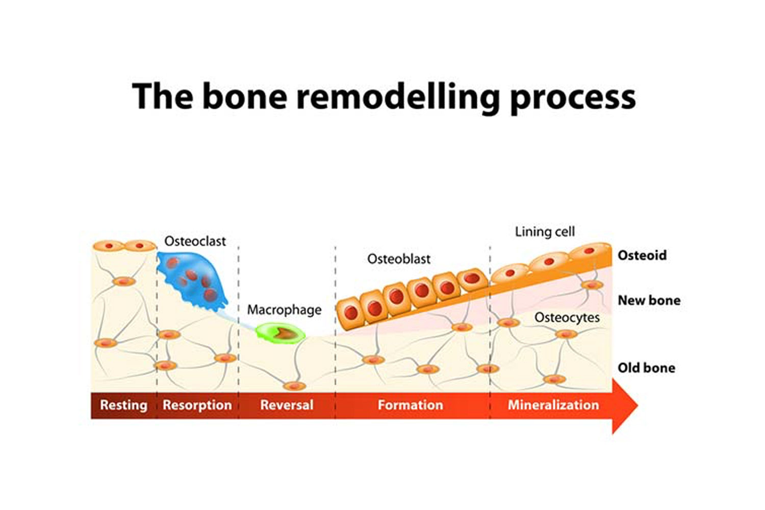 Osteoclasts 파골세포와 Osteoblasts 조골세포가 협력 작용하며 미세손상을 수리해나간다.