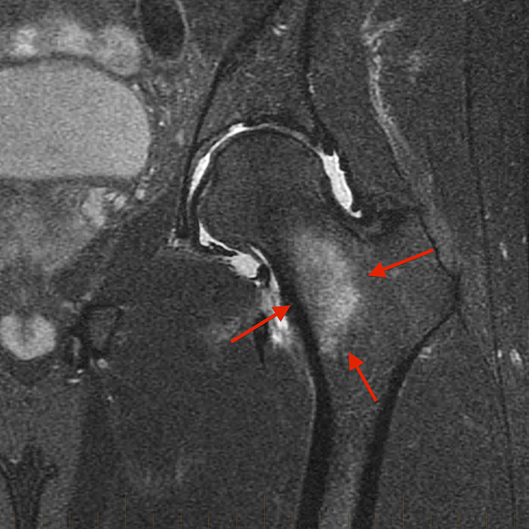 • 골반 X-ray는 고관절, 치골 결합 및 치골을 평가하는데 사용 될 수 있으며, 대퇴경부 또는 치골의 피로골절 가능성을 고려해야 함.