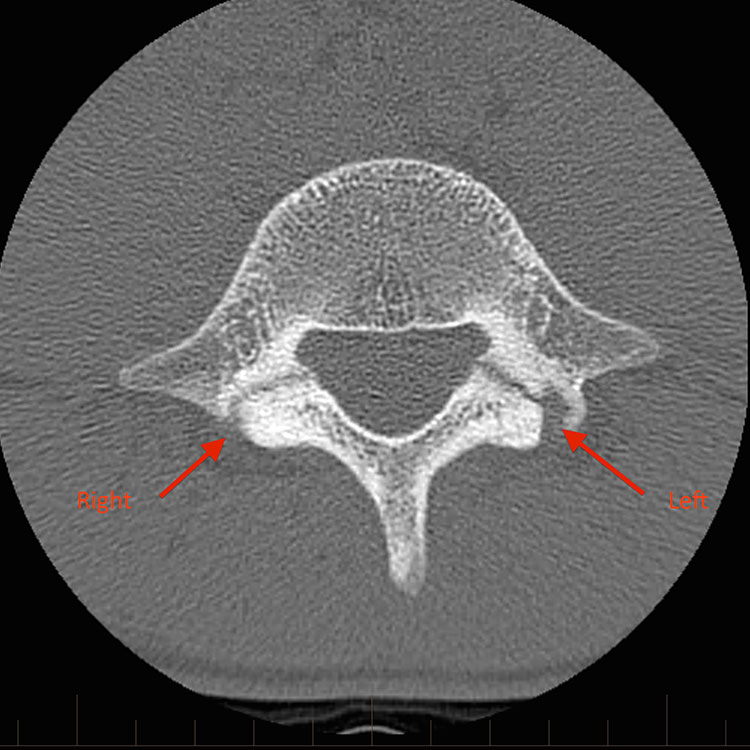 • 척추분리증의 골절선 유무 및 완전성을 추가로 확인하기 위해 표적 CT가 필요할 수 있다.